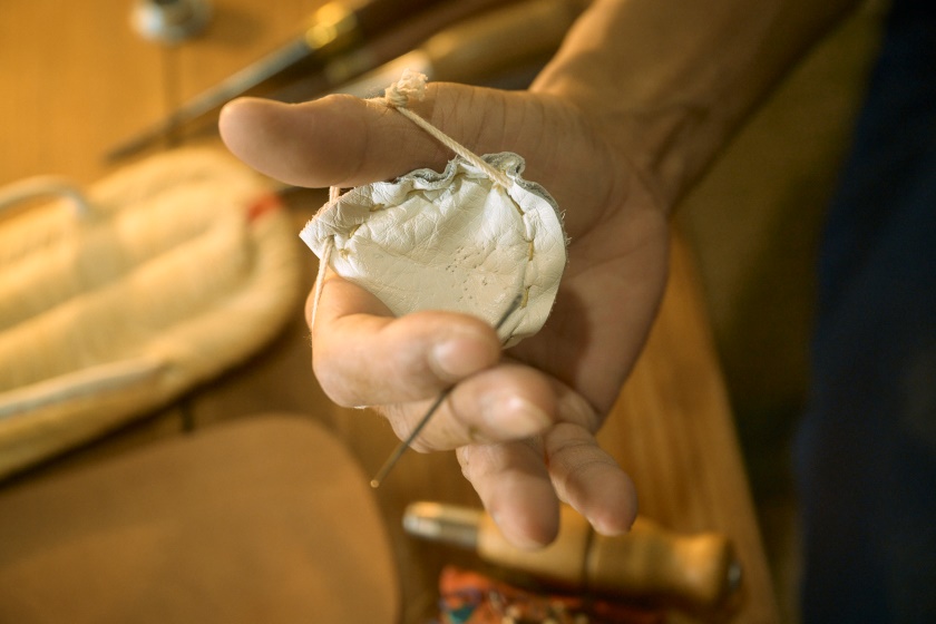 基本を身につけた壽ん三さんは、作業効率や実用性のアップを目指して、自己流の作り方を編み出していきます。たとえば縫製の工程では、パスタほどの太さのある針を分厚いオモテとレザーに貫通させるため、畳職人の使う布キャップを手に装着します。こうすることで針が真っ直ぐ刺しやすくなり、手にも優しい。おまけに、使う糸はアウトドア仕様の丈夫なものに変更。耐久性を高めて、長く履けるように工夫されています。