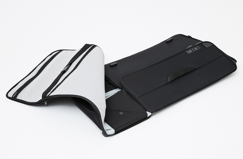 キャスターも取り外して、より薄さを徹底した折り畳みトロリー。ボディは一見ソフトだが、防水性や耐衝撃性に優れた高密度ナイロンツイルでタフさは申し分ない。ハンガーラック収納が可能。W52×H74×D29(折り畳み時5)cm。6万6000円(アントレックス)
