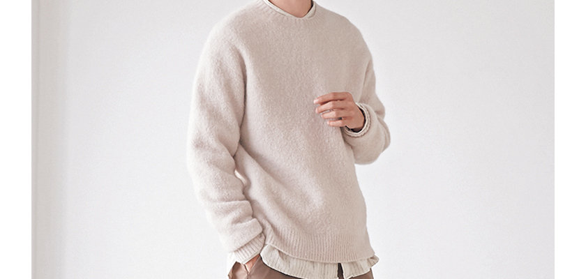 たとえば、定番のシャギードッグセーター。一般的にジャストなシルエットが主流ですが、今作は大人っぽさをキープできる程よいルーズシルエットにアレンジ。それゆえベーシックながら、今を押さえた着こなしが簡単に仕上がるんですね。加えて、この豊かな風合いが存在感を発揮し、1枚でこなれて見えるでしょ?
