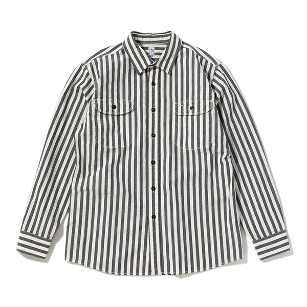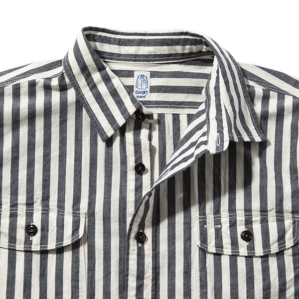 カトー定番である型にシックで落ち着いたブラックストライプを施したワークシャツ。綿麻の混紡糸を高密度に織り上げ、ワッシャー加工を施すことで洗いざらしの風合いが出て、着初めからこなれ感を出せるのがポイントです。