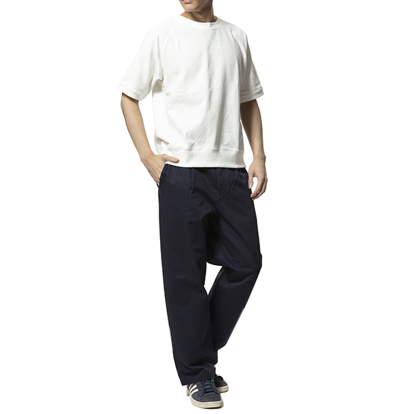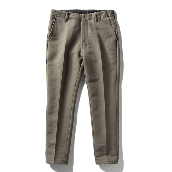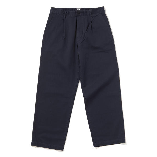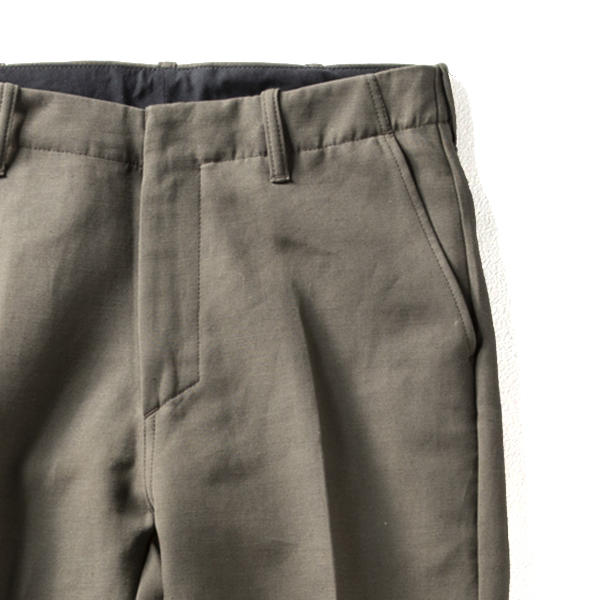 ヴィンテージ感漂う、太番手で織り上げられた左綾のチノクロス。粗野感のある素材を用いて、定番的に使えるワンタックパンツに仕上げています。タンブラー加工を施した柔らかなでこなれた風合いなので、最初からストレスなく穿きこなすことができるのも魅力。