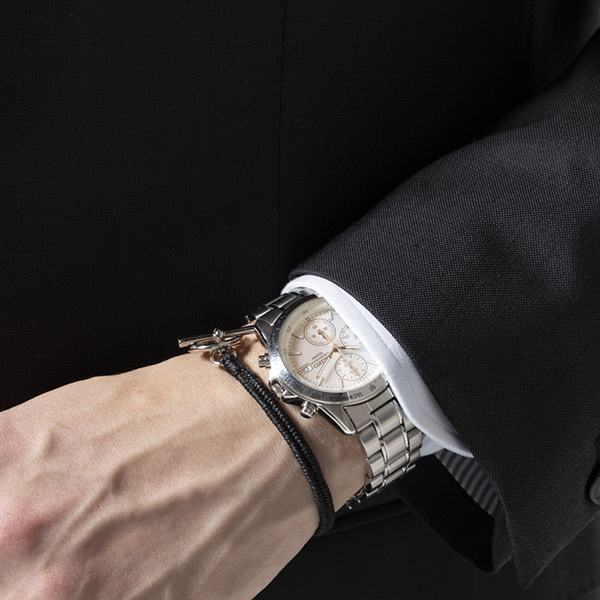 シックな黒なら、ジャケットの腕元にもこの通り。細身なので時計との重ね付けもでき、大人の遊び心を加えてくれます。