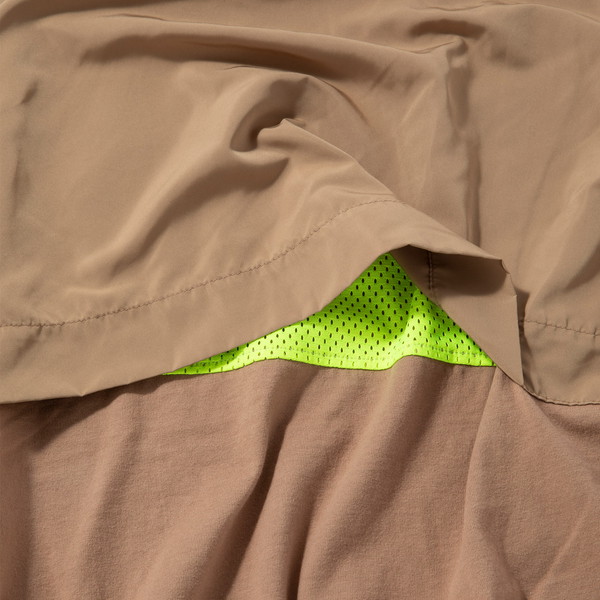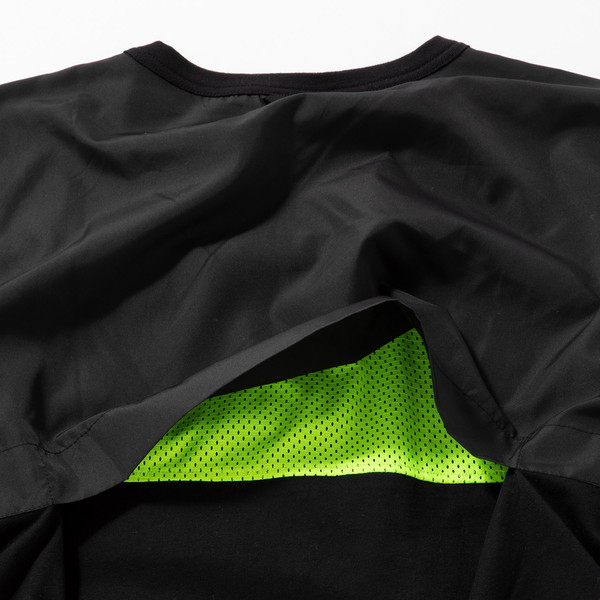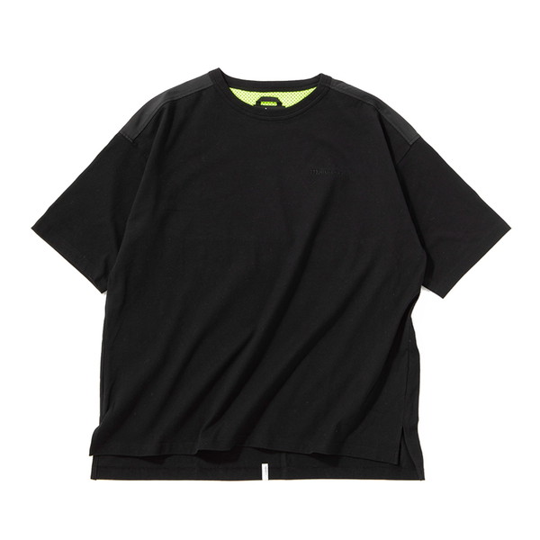 しかも、黒のワントーンながら素材の切り替え部分がいい感じのアクセントに。1枚着もキマります。しかもビギン別注では、内側のメッシュをネオンイエローに味付け! 遊び心ある派手目な色も、裏地なら大人が着ていても粋でしょ?