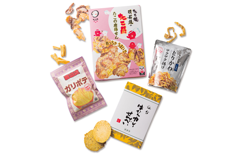 せんべいの原料に、贅沢にたこをのせて焼き上げ、植物油で唐揚げにしたスナック。しっかり味もついていて酒のアテにピッタリ。リピーターも多く、新大阪駅、伊丹空港では引っ張りだこの人気ぶりとか。85g。1100円。(元祖たこ昌)