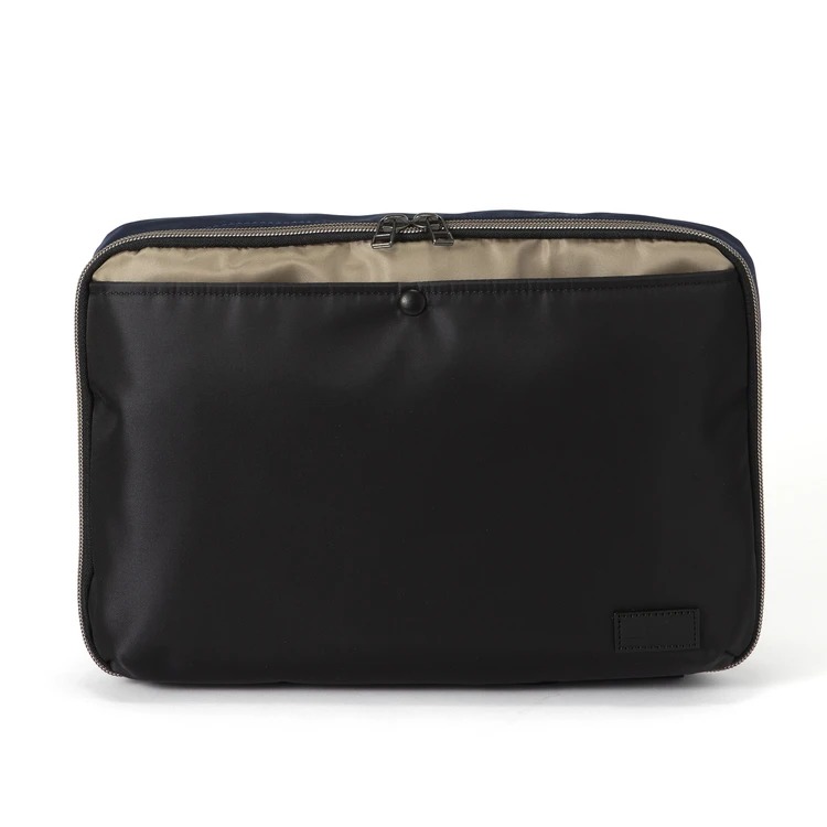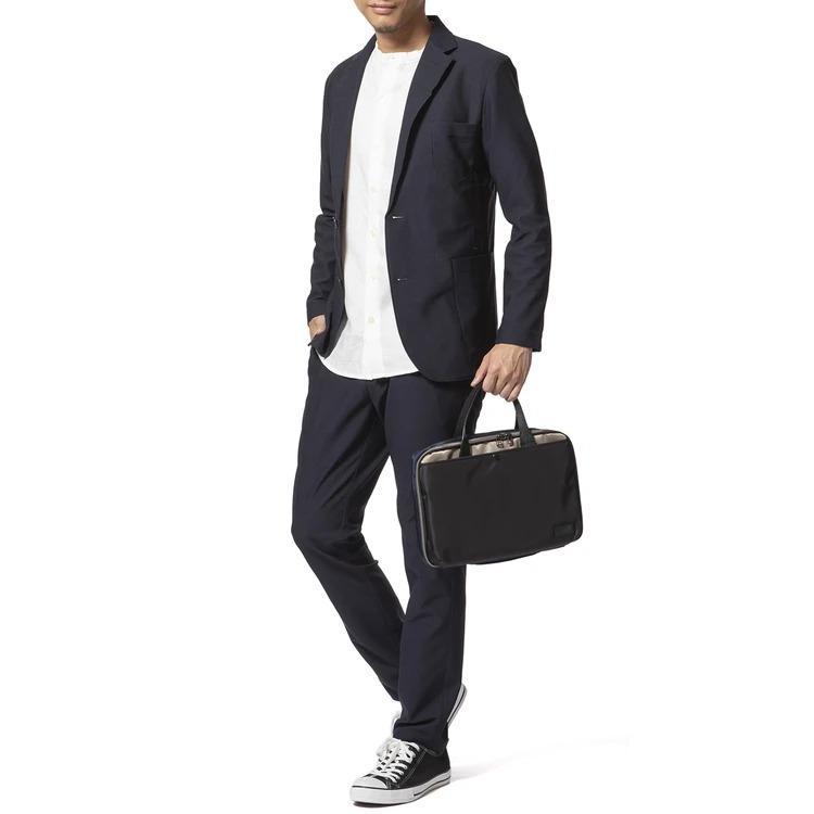 高密度ナイロンの上品な質感によってオンビジネスのスーツスタイルにも使えるのはもちろん、洒脱なバイカラーなのでカジュアルなスタイルにも馴染んでくれます。