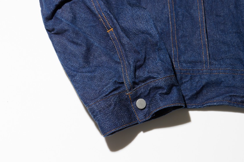 角を落としたフラップポケットを両胸に配した、オーセンティックウェスタンなスタイルのデニムジャケットながら、フロントはボタンではなくジップで開閉する仕組みで、よりスマートなルックスに。全体的なボリューム感は抑えつつ、アームホールが極端に広い独特なパターンで動きやすさとリラックス感も添えているのが面白い。