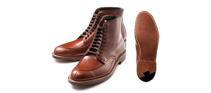 大定番のアルガンコンオックスフォード(通称:Vチップ)が初のブーツに! 程よいぽってり感のバリーラストにハンターブラウン色のボディも相まって、ドレッシーな短靴より男っぽい印象でしょ? カーフ革にダブルオイルドレザーのソールは、雨天けっこう使えます。(ラコタ)