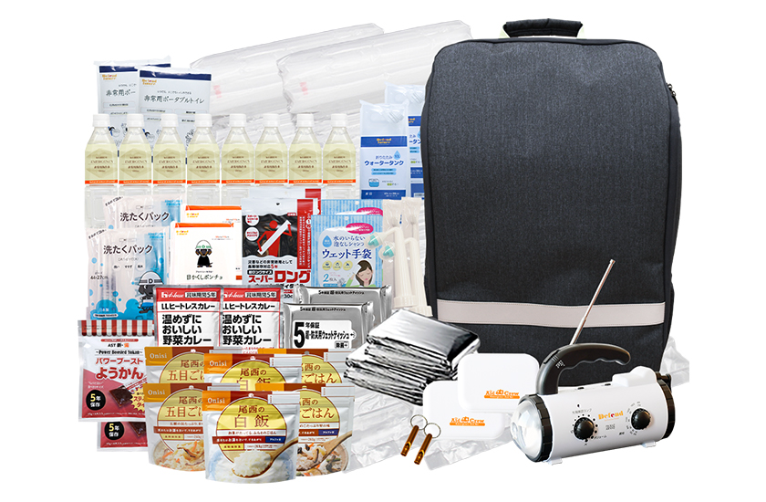 主な防災用備蓄品:飲料水、各種保存食、ラジオや懐中電灯、手回し充電機能など搭載のダイナモラジオライト、エアマット、アルミブランケット、洗濯パック、5年保存ボディタオル、シャンプー手袋、追加チェックシートなど