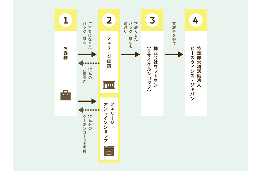 キャンペーン内容:不要になったバッグ&財布(ブランド問わず)を上記キャンペーン実施店舗に持ち込みのうえ、その場でフェリージ製品を購入すると10%OFFになる。