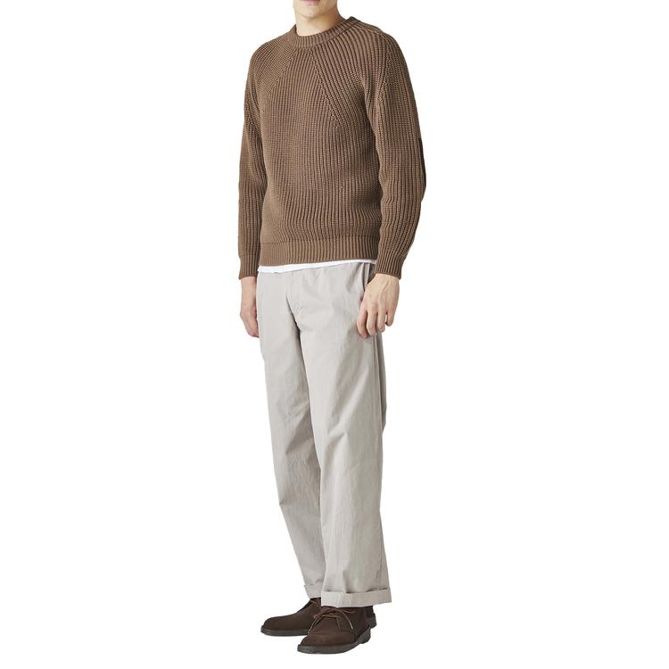名門ニットファクトリーのブランドとして、すっかりお馴染みのバトナー。ビギンもその虜になった一人で、恐る恐る禁断の相談を持ち掛けます。「シグネチャークルーって、別注できたりします……?」。ってのも本作といえば、ココならではの美しいニット技術がそのままデザインとなったような完成された逸品。さすがにアレンジは難しいか……、と諦め半分だったところ、「エルボーパッチを付けるくらいならできますよ」とのお言葉が。てか、それめっちゃいい、と我々は大コーフン!!で、早速試作をお願いするとミリタリーニットを思わせるような、コク増しのシグネチャークルーができちゃった♪