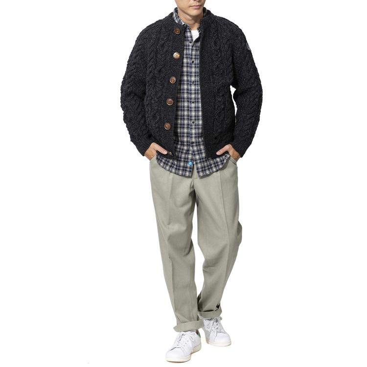 インラインのクルーネックニットを前開き仕様に。ニュージーランド産のウールを使い、数パターンの編地を組み合わせ表情豊かに仕上げ、水牛の角を使った大きなボタンがアクセントになっています。手編みならではの温もりと粗野なウールの質感はもちろん健在。前開きなのでさっと羽織れ、ケーブル編みのボリューム感がアウター並みの存在感を発揮。もともと登山用に作られていたこともあり、防寒性だって申し分ナシです。