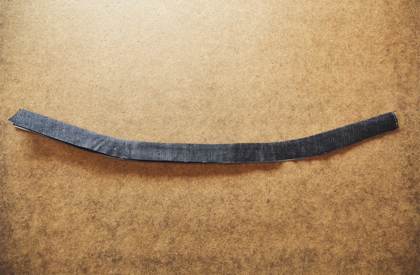 カーブが強すぎるとフェミニンな雰囲気になるので、メンズっぽさが残る曲線を検討。たどり着いたのが現在のラインでした。上下の差は約3cmで、ジーンズに組み込まれるとパッと見ではカーブベルトとわからないですが、穿くとフィット感がしっかり伝わってきます。