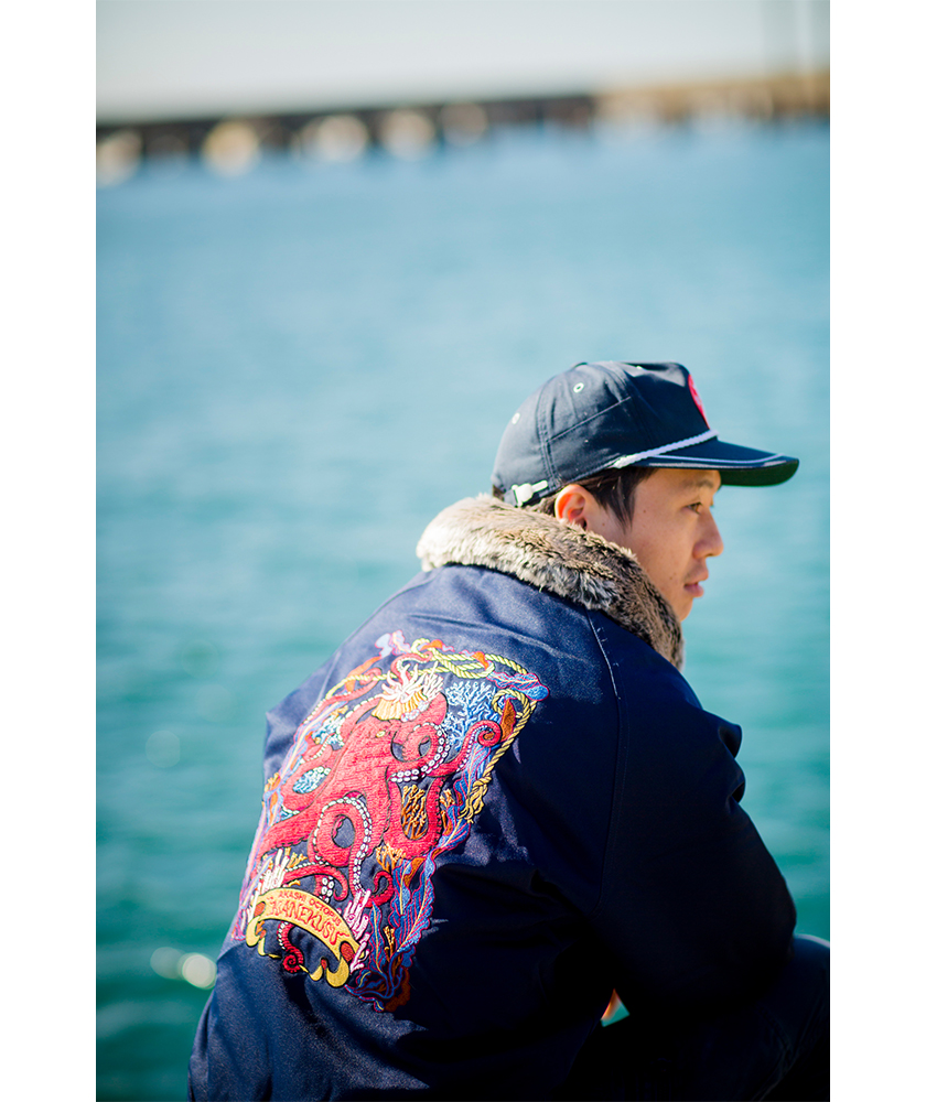 たこをモチーフにした巨大な刺繍のバッグプリントが入った金楠水産オリジナルカストロコート。ベースは作業着ブランドの「寅壱」。
