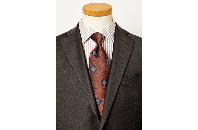 タイの地色とシャツのストライプをスーツと同じ茶系で揃えると柔和な印象に。女性クライアントと食事、なんてシーンにぴったりだ。シャツとタイは上のトルソーと同様。