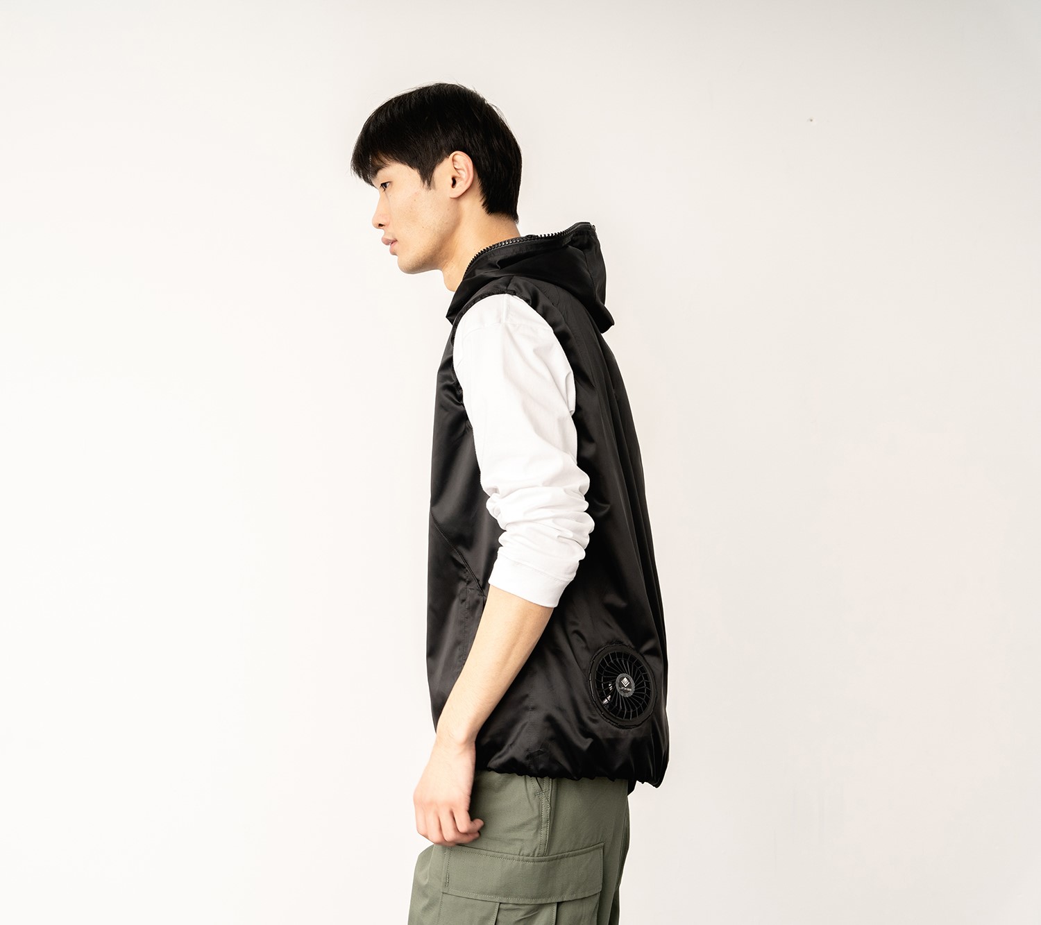 MA-1だけでなくファン付きベストも展開。バックスタイルには、もちろんファンが2つ付属します(※ファンやバッテリーの機能はMA-1と同様です)。フードのてっぺんまでつながるフロントのジッパーも特徴で、デザイン的なアクセントとしても効果的。また、フロントには大きめのファスナーポケットが付いているので、ミニ財布や携帯なんかを入れて持ち歩くのに便利です♪ 4万9500円。【問】タイガリオナ/https://www.taigaliona.jp/c/all