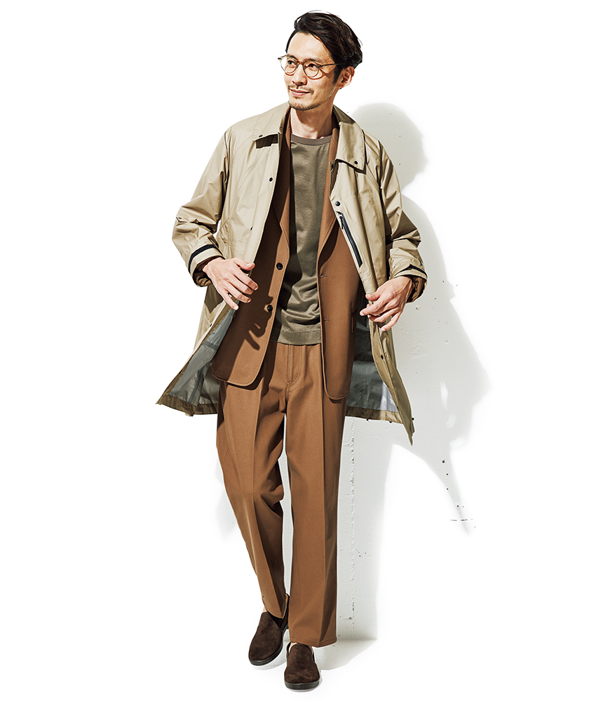 IN⇔OUTできる服もいいですが、より登板機会の多い服が欲しいならON⇔OFF両刀使いできるものを選ぶのも賢いでしょう。たとえばこれからの季節ならシンプルなスプリングコート。とくに最近のアウトドアブランドのハイテク系は仕事にも遊びにもと、使い勝手がメチャいいんですよね。