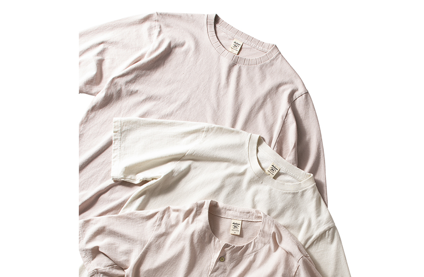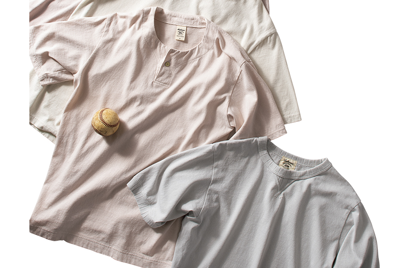 いずれもクラシックな米綿製。モデルごとに生地の厚みやネックの仕様も変えているのがニクい。上から5分袖T(5500円/ドロップグレー)、ポケT(5500円/ドロップグリーン)、ベースボールシャツ風のヘンリーネックT(6050円/ドロップピンク)、クルーネックT(6600円/ドロップブルー)、というラインナップ。