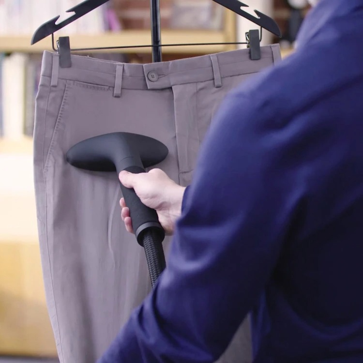 シワを伸ばすコツは、生地を軽く引っ張りシワを広げながらスチームをかけること。スチームヘッドをなでるようにシワの方向に動かせば、みるみる綺麗になっていきます。本体に付属のハンガーをセットできるので、服をかける場所を探す必要もなし。>>>詳しくはこちら