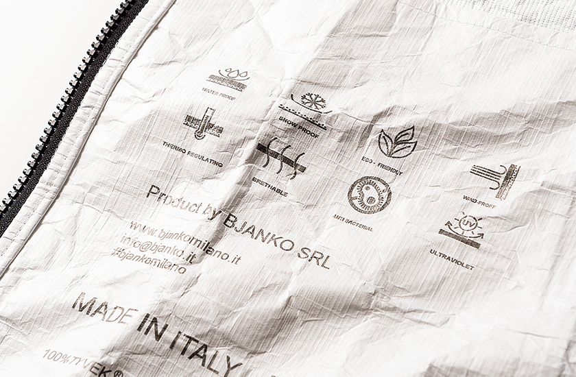 じつは「ビアンコ」は、高機能素材をファッションに落とし込むことに情熱を燃やすイタリアの気鋭ブランド。このタイベックは本来染色に適さない素材なのですが、独自のプリント技術を駆使してご覧のニュアンスたっぷりの色柄を実現したんです。