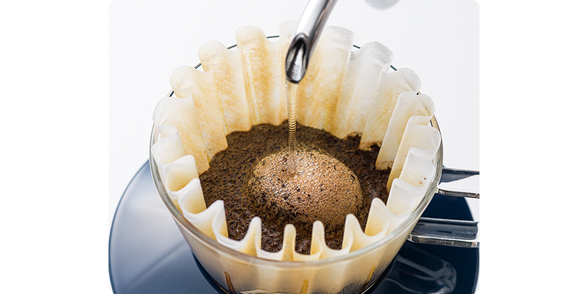 中央にそっと湯を落とし、10円玉くらいの小さな円を描くように注いでいく。このとき、膨れたドームの周囲にできる“土手”を崩さないように注ぐとスッキリした味に。