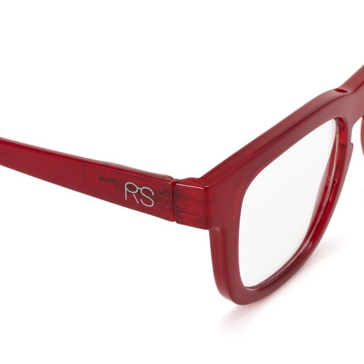 フレームは人気の高いウェリントン型ベース。鮮やかなレッドでアピール度が高く、テンプルの先端が丸く仕上げられるという小技も効いてます!