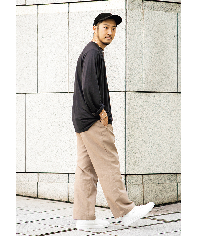 ゆったりとした上下に、あえて白のスニーカーを合わせることで、リラックスした中にも崩しすぎないスタイルを表現。ウェアはすべて佐藤さん私物。