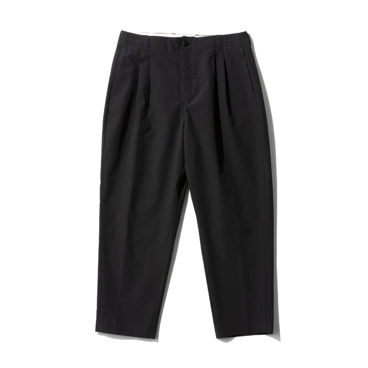 スラックスは2型あって、この“Naughty(ノーティ)”は学生時代のぶっといパンツ、いわゆるボンタンに着想を得てデザインされたモノ。2タック入りの太い腰まわりとワタリから裾に向かって強いテーパードのかかったワイドパンツは、昔懐かしさもありながら今っぽいテイストを味わうことができる一品に仕上がっているワケですね。