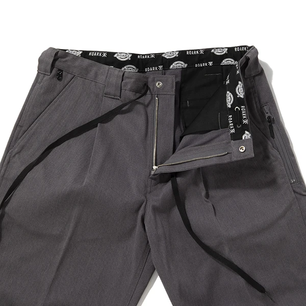 ベースとなっているのはROARK REVIVAL定番のトラベルパンツ。生地はディッキーズの十八番、TCストレッチクロスを採用しています。ロアークのアイコンのバーティカルセキュリティポケットを備え、さらにウエストはドローコード調整が可能なベルトレス仕様。
