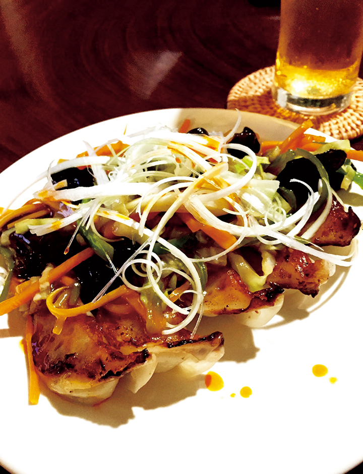 (4)電子レンジで温めた餃子に(3)をかけ、仕上げに白髪ネギをのせる。