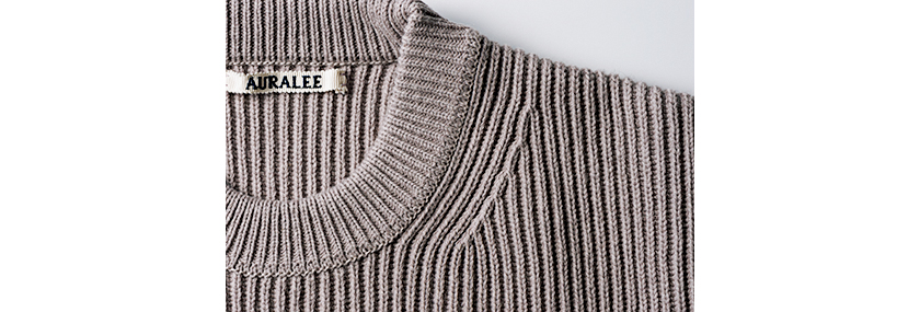 オーラリーでもスタート当初から継続展開している、言わば代表作のひとつ。ただ決して珍しくないニットだからこそ、普通に作ると平凡な顔つきになってしまう。そこでオーラリーにしかない個性を落とし込むため、目の立ち方にはとことんこだわりました。