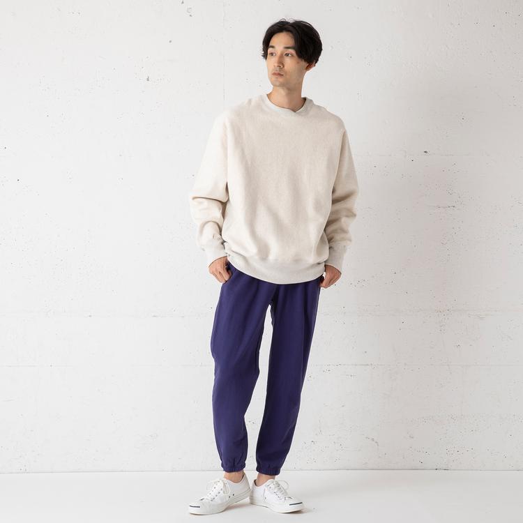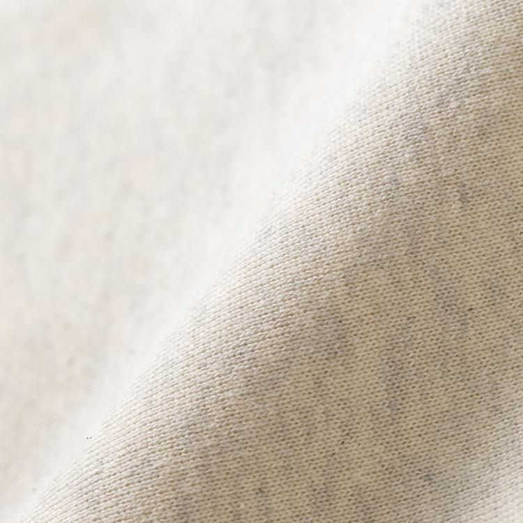 コットン生地ですが秋冬仕様の裏起毛なので保温性もバツグン。密度の高い起毛はこだわって編み上げられているので優しい肌触りで着心地もふんわり。また、程よく厚みがあるのでヘタレにくく、長く着てもありがちな部屋着に成り下がるクタクタ感にもなりにくい! 大人が求める自然体な雰囲気をよ〜くわかっている生地感です。