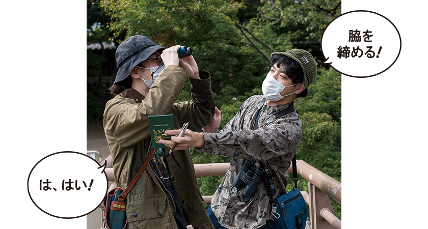 双眼鏡で観られる範囲は狭く、ちょっぴり角度がずれただけでも鳥を見失ってしまう。肉眼で鳥に狙いを定めたら目線は離さず、双眼鏡をそっと目の前に持ってこよう。