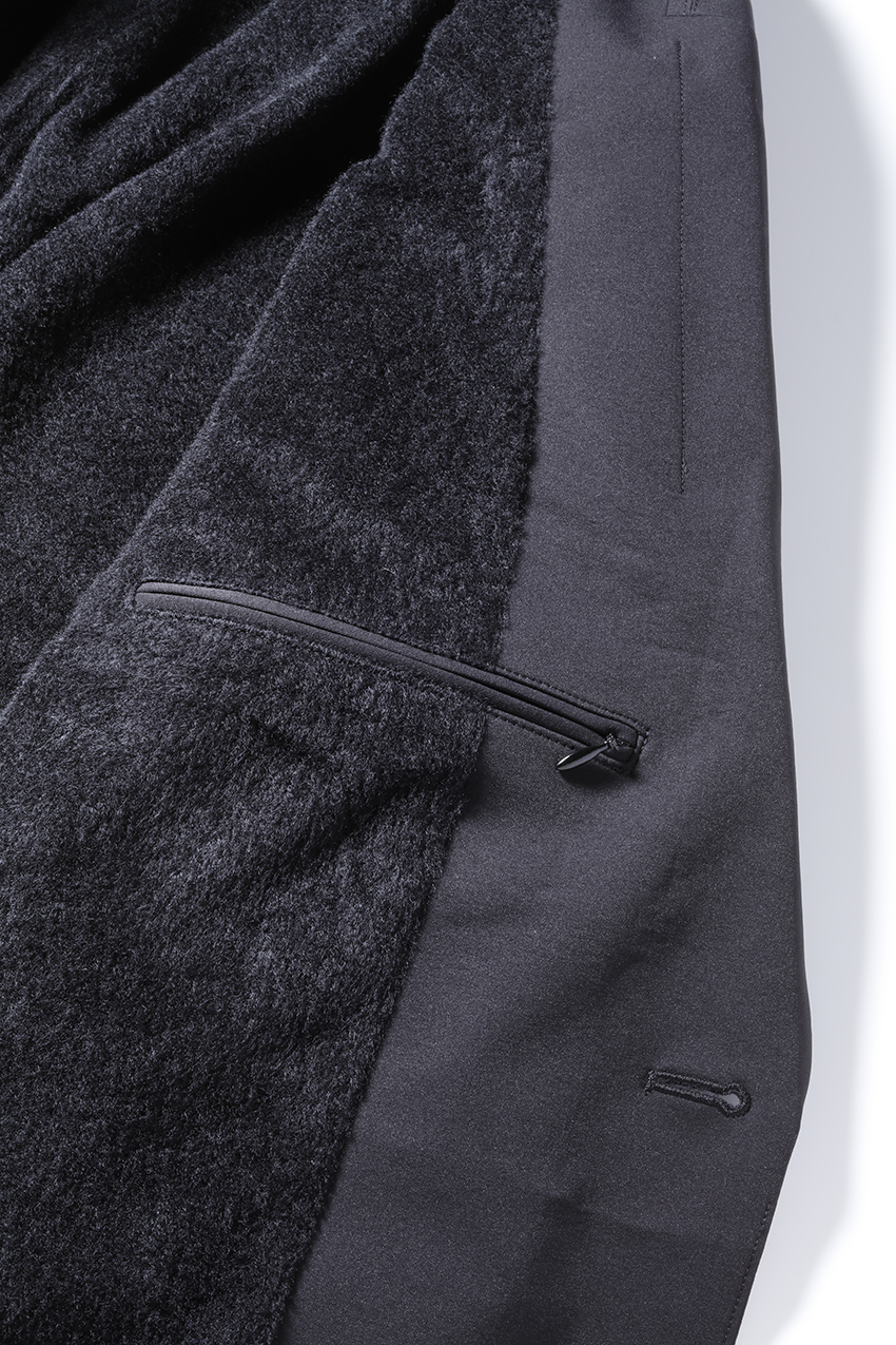 デライトは空気を効率よくため込める中空糸を使った、起毛素材です。するとたっぷりと嵩高くライナーに敷かなくても、ポカポカの保温性が得られます。これまたセットアップには非常に大きなメリットで、袖を通しても以前と変わらずスタイリッシュ♡ オンタイムのタイドアップに羽織っても、まったく違和感がありません! でも着心地は冬の寒空も何のその!、な温かさなんです。もちろんパンツの裏地にもデライトが使われていて、全身ポカポカで過ごせます。また空気をため込むことで生じる自然な保温性能ゆえに、熱すぎる嫌いもなし。すると屋内でもサラっと快適に羽織れる。つまり屋外でも屋内でも関係なくコンフォート♪ これもデライトのメリットなんですね~。