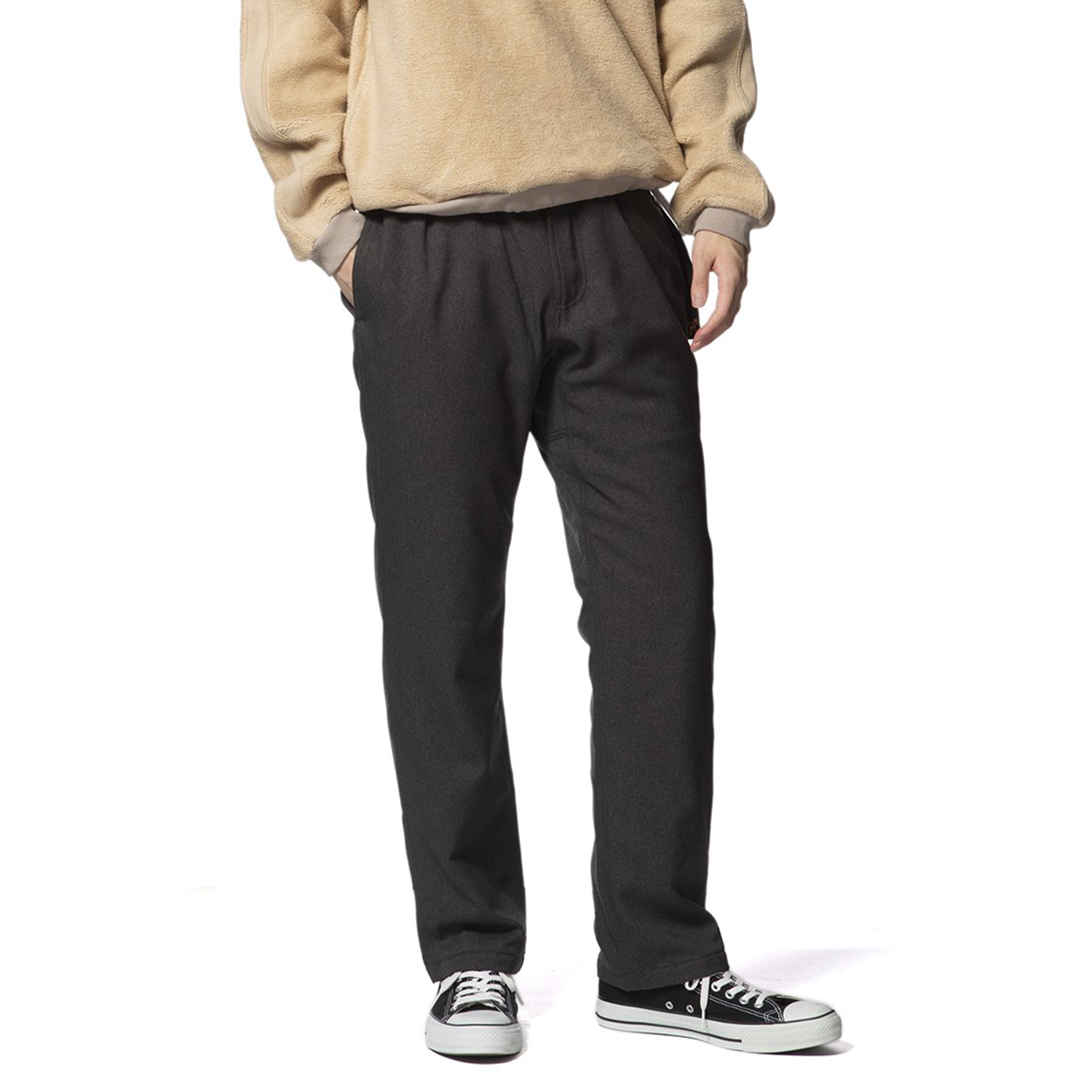 太めのシルエットながら裾にかけて自然に細くなるテーパードシルエットなので、穿きやすさは健在です。バックポケットにはブランドロゴがあしらわれており、パンツインスタイルもカッコよくキマります。