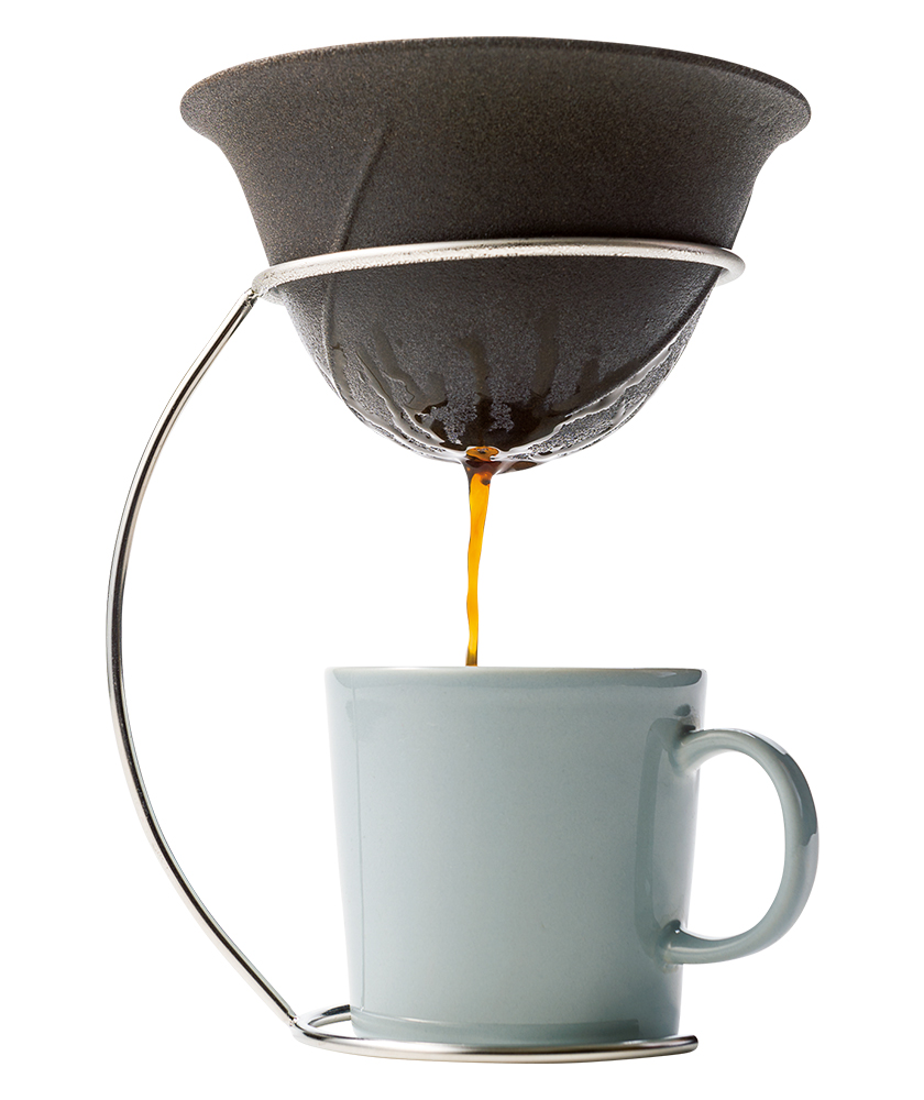 セラミックが持つミクロン単位の孔による最適な抽出速度のドリップで、雑味や苦味を約70%カット。クリアなコーヒーが楽しめる。水洗い、湯通しすることで何度でも使用が可能。本体Φ約132×H78mm。スタンドH16.5cm。セットで5830円(ファンプロジェクト)