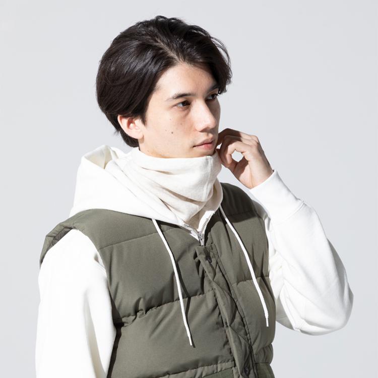 イイトの超キモチイイ定番素材「ミッドエアー」を使ったスウェットファンと共地のネックウォーマー。肌心地は保証済み。