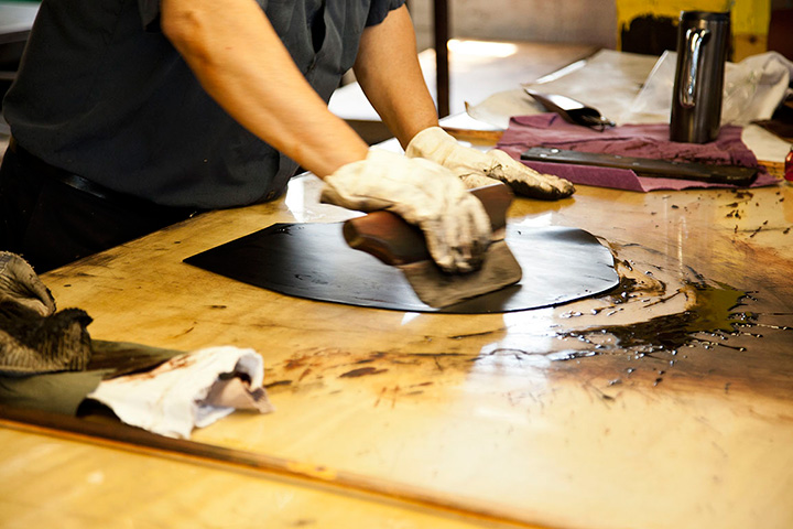 4か月もの間ピット槽でなめしたレザーは、その後の加工も多岐にわたる。コードバン層を出すためのシェービングや手塗りによる染色など、手間を惜しまず昔ながらの製法を守り続けている。コレが上質なコードバンが生まれる秘密なのだ。