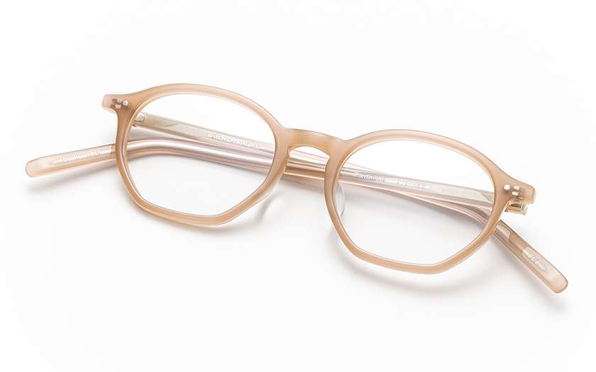 丸みを帯びた多角形シェイプに柔らかなベージュの組み合わせ。乳白色の素朴なカラーリングと質感で、レトロな味わいが増している。クラシックフレームの変化球にも最適な1本だ。
