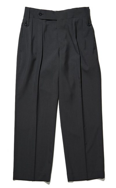 2020年デビューの新鋭ブランド、タンジェントのブリティッシュアーミーパンツ。40年代に英国軍が採用していたグルカパンツをベースに、トロピカルウールの生地やマーベルト裏の芯地などがドレスさを後押しさせた一本。