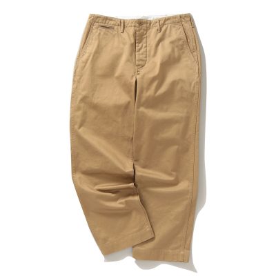 リラックス方向だけでなく、ドレス方向へと舵を切った軍パンもまた、年齢を重ねた大人にとっての最適解。なかでも、本気で一歩先を行くなら“無骨”と“品”の双方向に深度が求められます。スラックス然とした顔つきでビズにも使えそう。だけどよ~く見ると激渋軍パンの意匠がチラリと利いている、なんて超オンオフ兼用向きなんです!