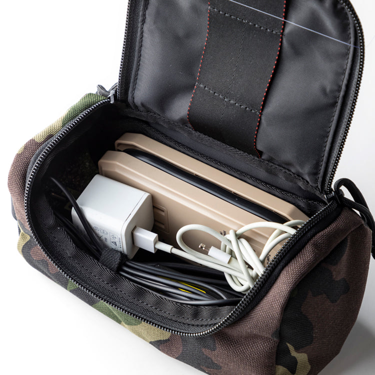 モバイルバッテリーやUSBケーブル類などなど。散らばるガジェット類は、こちらのマルチユースケースでスッキリ。タフなナイロンファブリックにアイコンのウェビングテープがあしらわれ、ブリーフィングならではの骨太な雰囲気がいいでしょ?