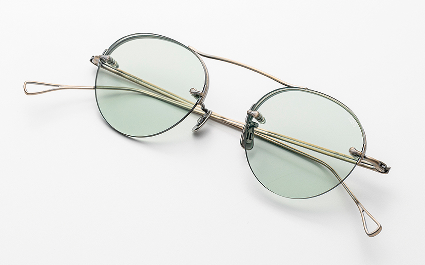繊細さと無骨さが絶妙にミックスされた、ツーポイントのハイブリッジ。メタルパーツに施されたミル打ちが、上品な印象を後押しする。趣のあるレンズシェイプに淡色レンズが好相性だ。
