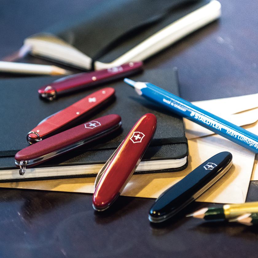 もともと、文房具のような小さくて目的の限られた道具が好きで集める癖があるんです。ここで紹介しているビクトリノックスも同じ道理で、何かを切るためだけの機能しか持たず、2枚のブレードが効率的かつコンパクトに格納された設計とフォルムが大好きで、20代の頃から少しずつ蒐集。