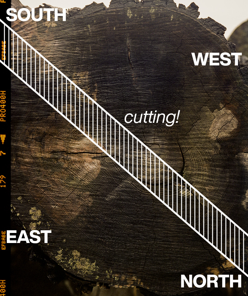 そして、製材にも太一郎さんは決して手を抜かない。「一般的に価値があるとされている材は、南寄りの東西にかけて挽いたものです。南側の方がよく日が当たりますから、ラクな杢目=キレイな木目をしとるんです。養分をようけ摂るから太って、芯が北側にズレとるでしょう? 反対に北側は日が当たらず、厳しい環境で育つからキズや節が出る。でもね、力強いんです。だから私は、”南北にかけて挽く”。ラクな表情もツラい表情も一枚の板で表現したいんです。裏表があるほうが人は安心しますし、飽きがきませんから」(太一郎さん)。