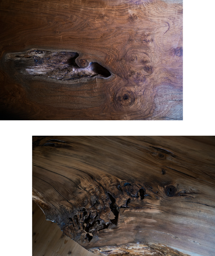 深い赤みと包み込むような優しい杢目が目を引くタブ。少ない日照時間でも育つ陰樹で、こちらは神社の御神木として育ったが、倒木の恐れがあることから要請が入り切ることになったそう。景さんが初めて制作した一枚板テーブルでもある。「変形している部分は、自然乾燥の段階で朽ちていったところ。極力、自分で形を作らず、自然が成す曲線を大事にしました」