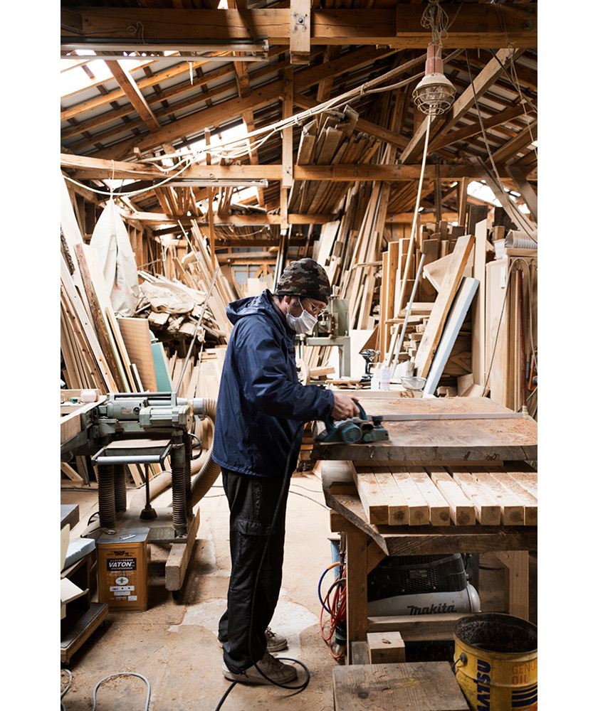 20年をかけてやっと辿り着いた、最終地点。それが仕上げ工程だ。その重要な役割を担うのが、太一郎さんの長男・澤 博臣さん。制作現場は「鳥ノ木」から車で5分程度の場所にある。今か今かと完成を待ちわびる木々たちの声を浴びまくっても、一切動じず、ただ目の前の仕事と向き合う。大工道具の手入れも決して怠ることはない。自然の造形美を生かすには、工具のキレ味が必要不可欠だからだ。