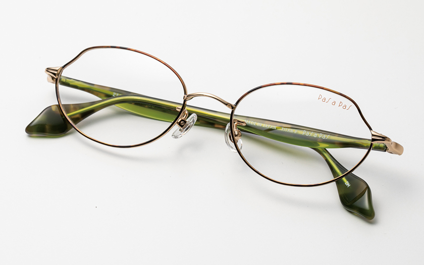 パサパ定番の、花びらをイメージしたレンズシェイプを採用。リムの前面はデミ柄で、可憐なデザインをシックに引き締め。デミ柄にグリーンを効かせたテンプルのカラーリングも洒落ている。