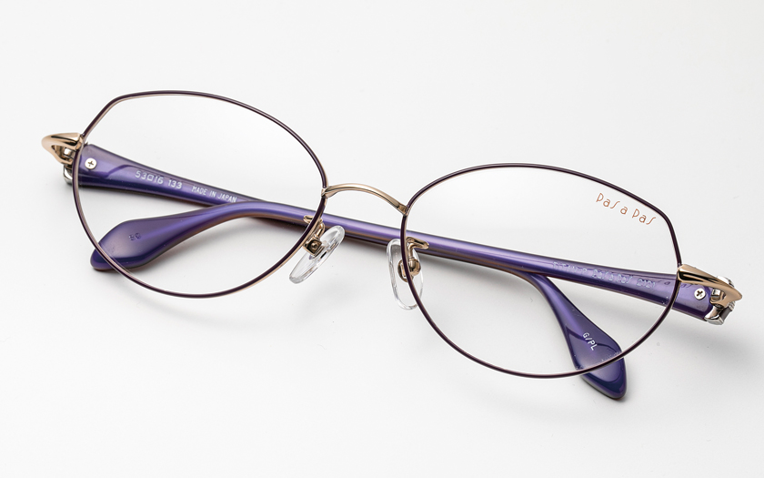 サイドに窪みをもたせてメリハリをつけたレンズシェイプが、パサパならでは。アーモンドをイメージしたブラウン系のカラーリングにパープルを効かせ、大人っぽい雰囲気に仕上げている。