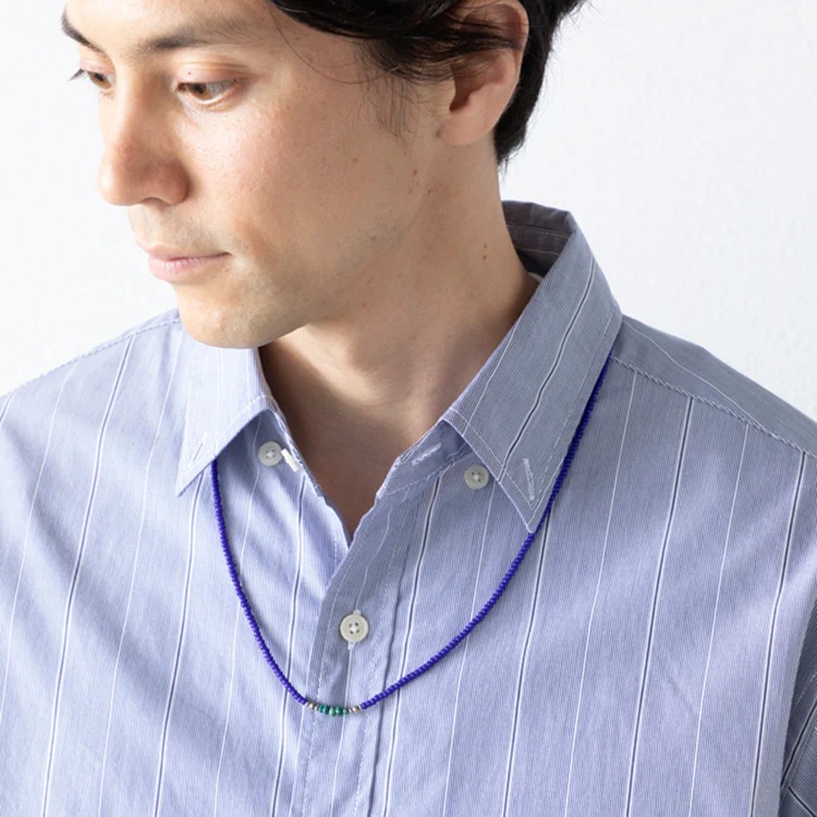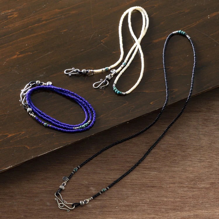 ビーズのメインカラーはブルー、ブラック、ホワイトの3色展開で、いずれも両端と中央のターコイズがアクセントに。夏ってなぜかターコイズ色に惹かれますよね?鮮やかな発色とひんやりとした艶が夏にはまりまくり!>>>詳しくはこちら