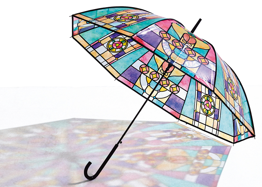 幾何学模様デザインのステンドグラスをモチーフに作られ、開けば大正ロマンな世界が一気に広がる傘。差した姿が絵になるのはもちろん、太陽や夜の街頭で光が差し込んだときに映し出される色柄が、なんともシャレてる! 全長約90cm。1980円(フェリシモ)